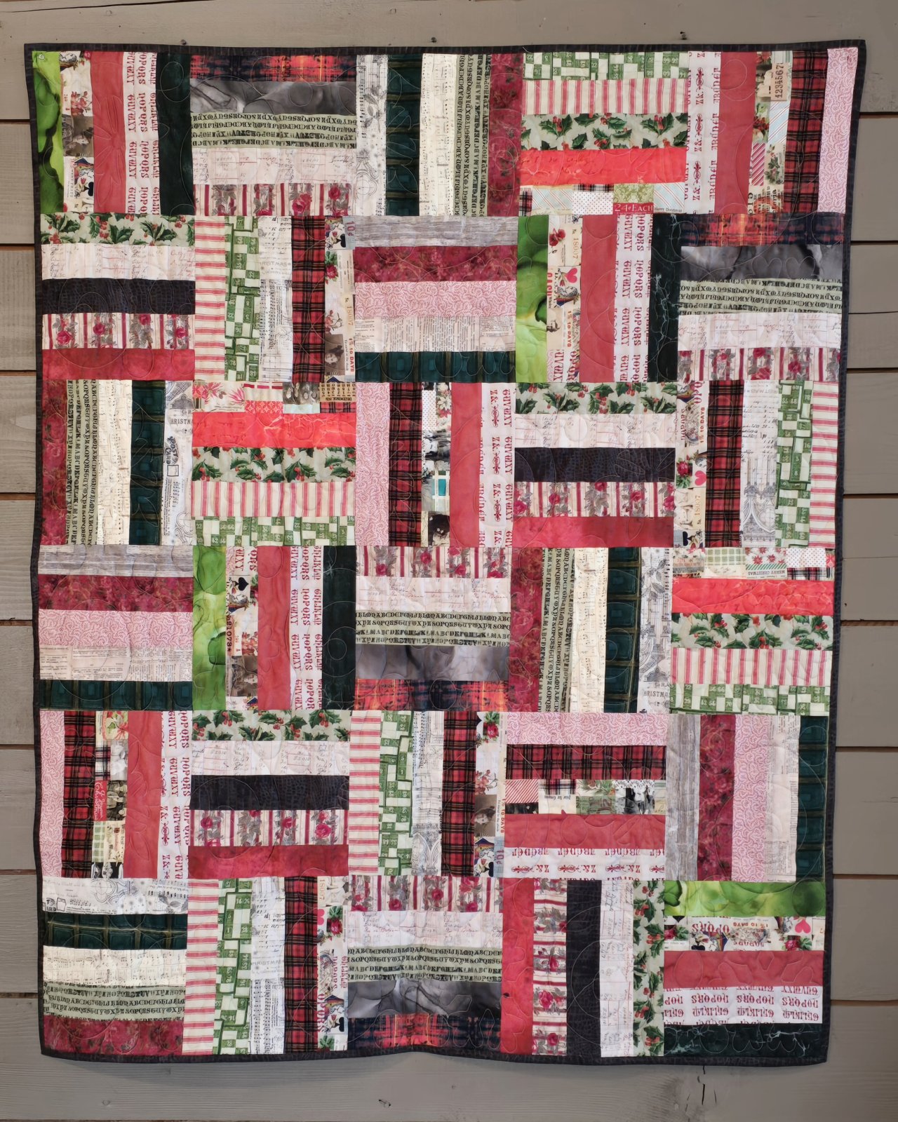 The Basket Case Quilt Kit - Christmas Palette uses a jelly roll and features the Tim Holtz Eclectic Elements Palette in Christmas line of fabric. Binding is included. Finished size is 50 x 60.