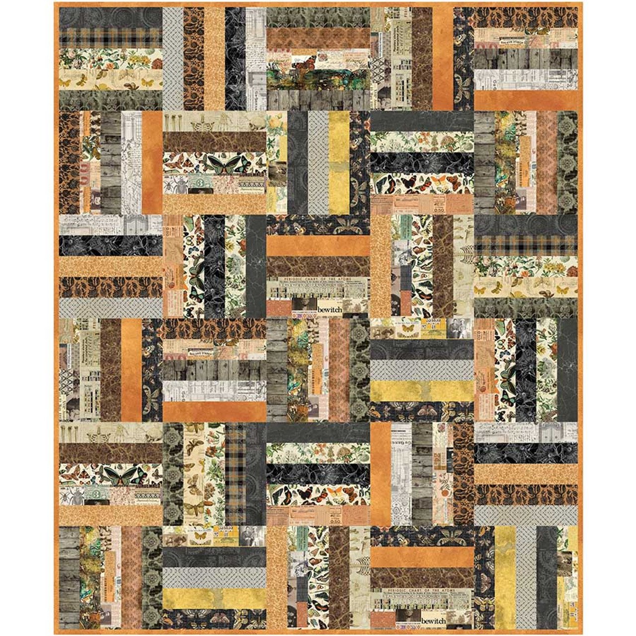 The Basket Case Quilt Kit - Halloween Palette uses a jellyroll and features the Tim Holtz Eclectic Elements Halloween Palette fabric line. Binding is included. Finished size is 50 x 60.