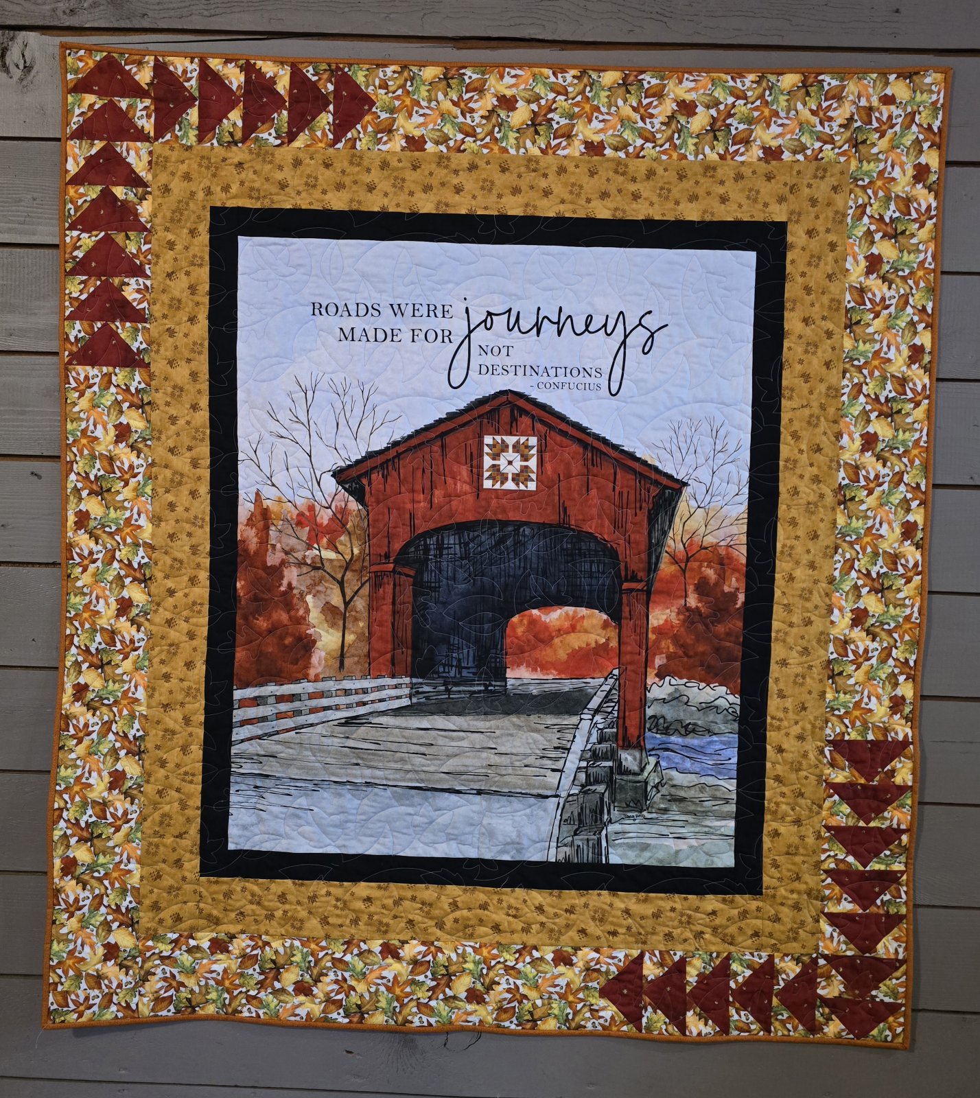 The Beach Walk Quilt Kit - Covered Bridges in Fall uses a panel and features the Covered Bridges in Fall line of fabric by Riley Blake. Binding is included. Finished size is 59 x 68.