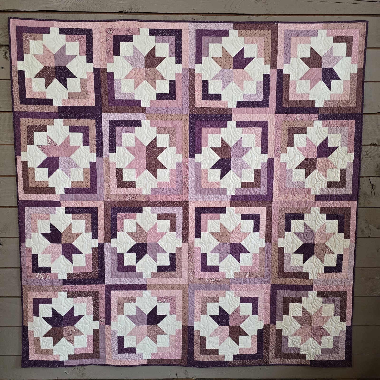 The Cozy Cabin Quilt Kit - Lavender Fields features the 3 Sisters Lavender Fields line of fabric by Moda. Kit uses fat quarters. Binding is included. Finished size is 80 x 80.