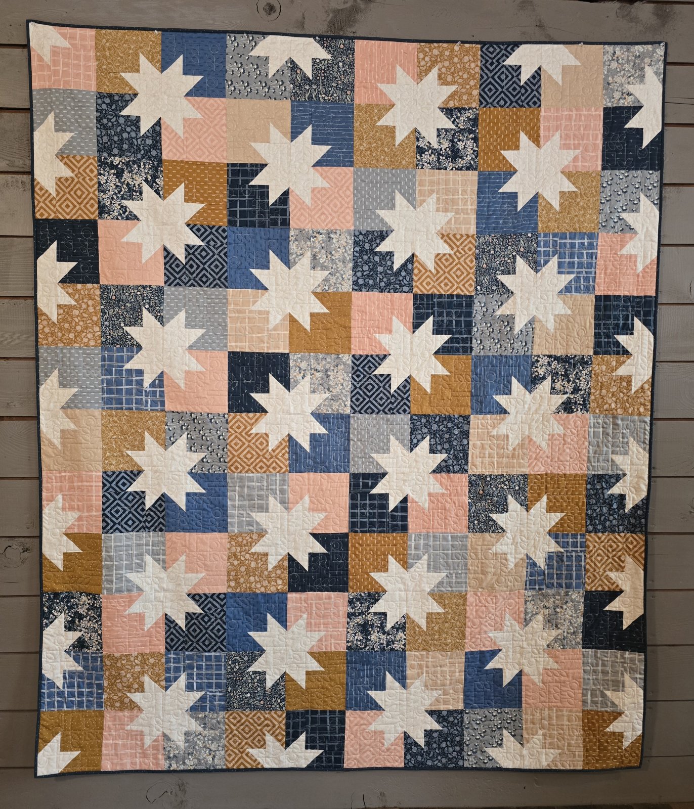 The Star Pop Quilt Kit - Rainier is a fast and fun sawtooth star quilt that features the Rainier fabric line by Moda. Finished size is 75 x 90. Binding is included.