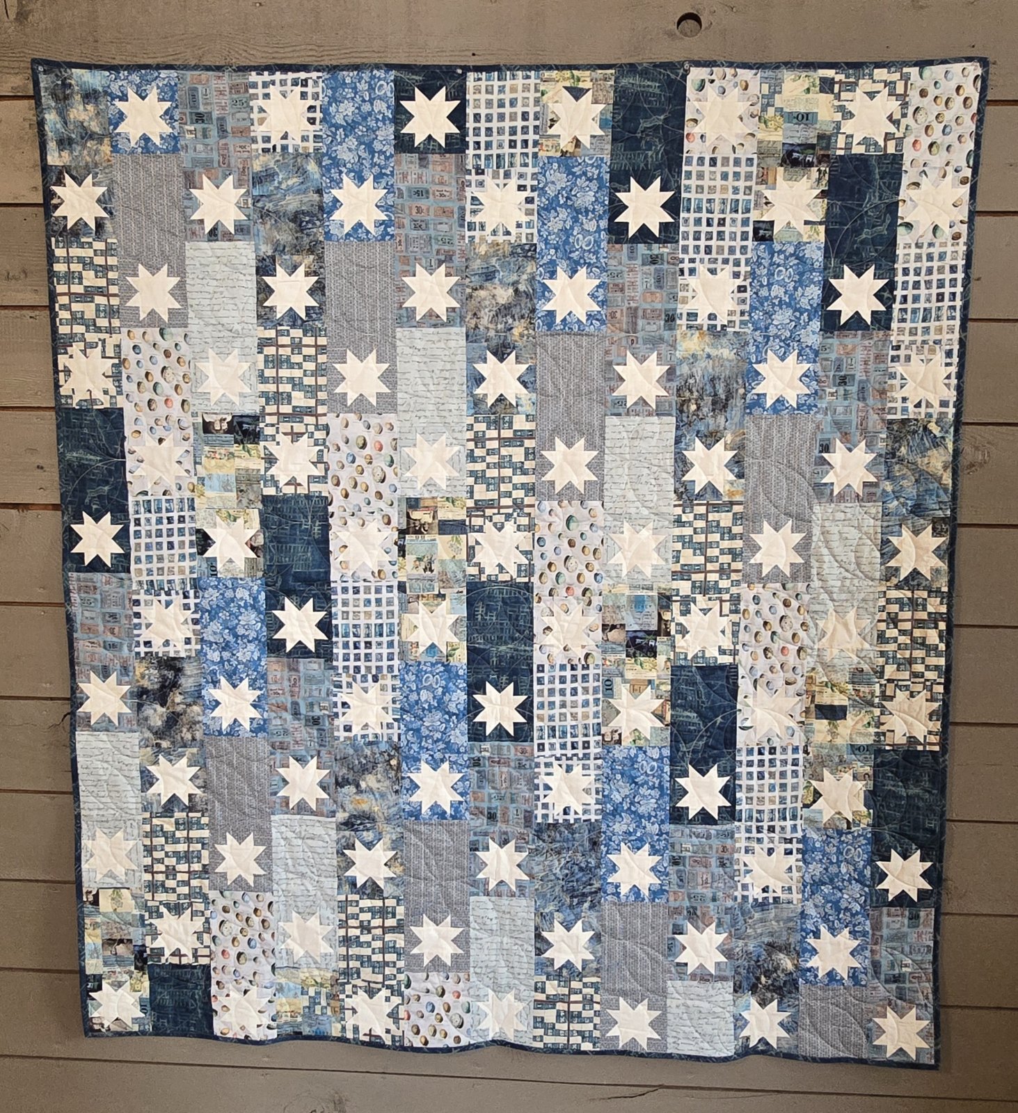 The Starlets Quilt Kit - Tim Holtz features the Tim Holtz Palette Blue fabric line by Free Spirit. Binding is included. Finished size is 65 x 72,