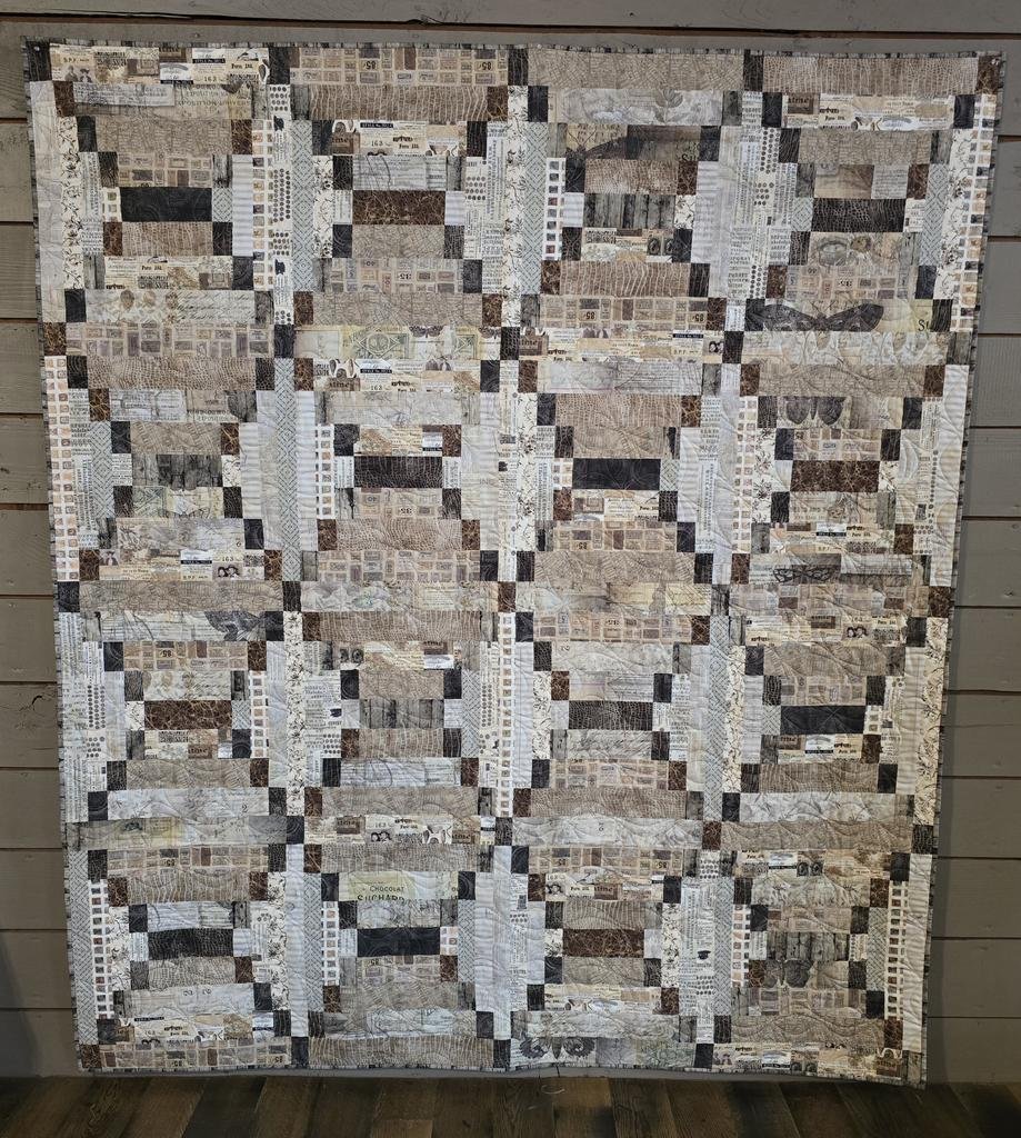 The Weathered Quilt Kit features the Tim Holtz neutral palette of fabric along with some blenders. Finished size is 71.5 x 82.5. Binding is included.